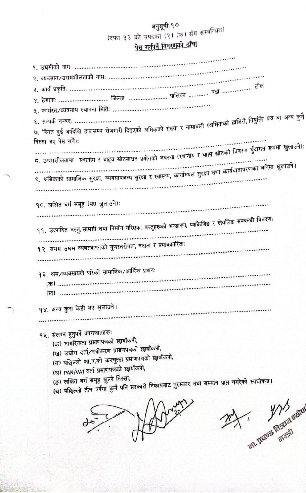 फागुन १०, २०८२ उत्कृष्ट उद्यमी सम्मानका लागि आवेदन (अनुसूची-१०)