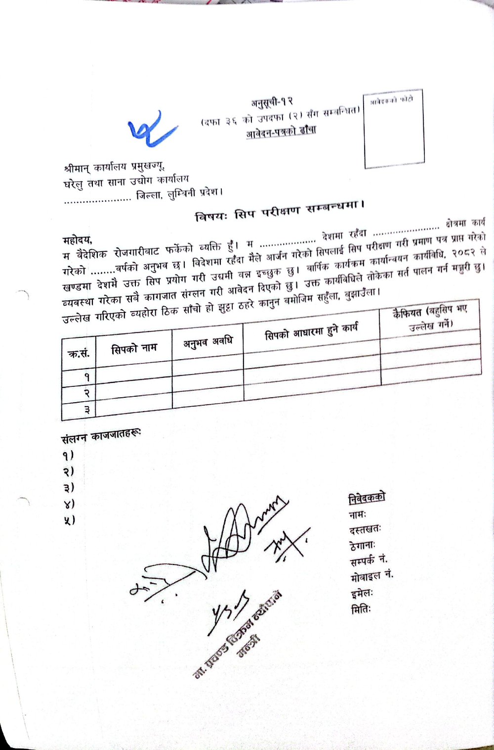 फागुन १२, २०८२ वैदेशिक रोजगारीबाट फर्केका श्रमिकहरुको सिप परीक्षणसम्बन्धी आवेदन (अनुसूची- १२)