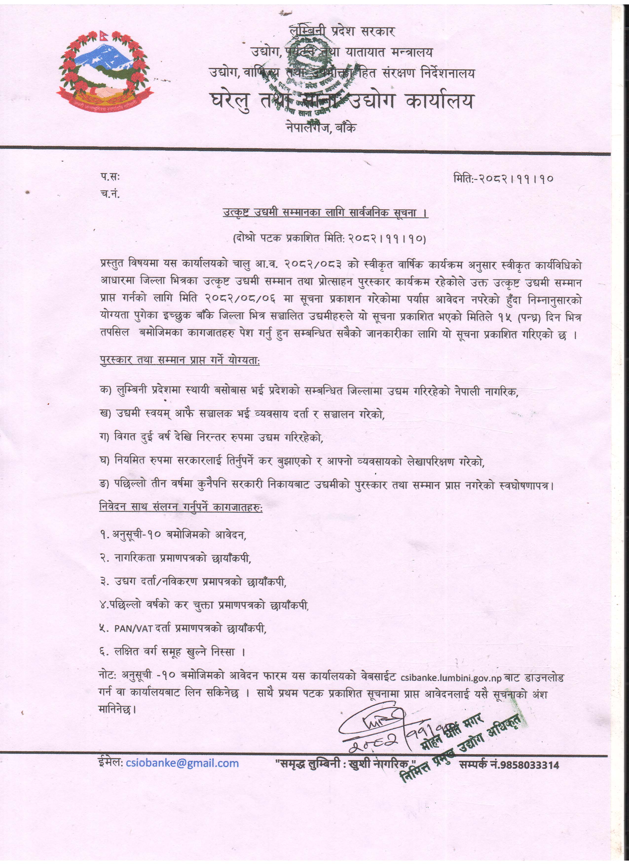 फागुन १०, २०८२ उत्कृष्ट उद्यमी सम्मानका लागि सार्वजनिक सूचना।