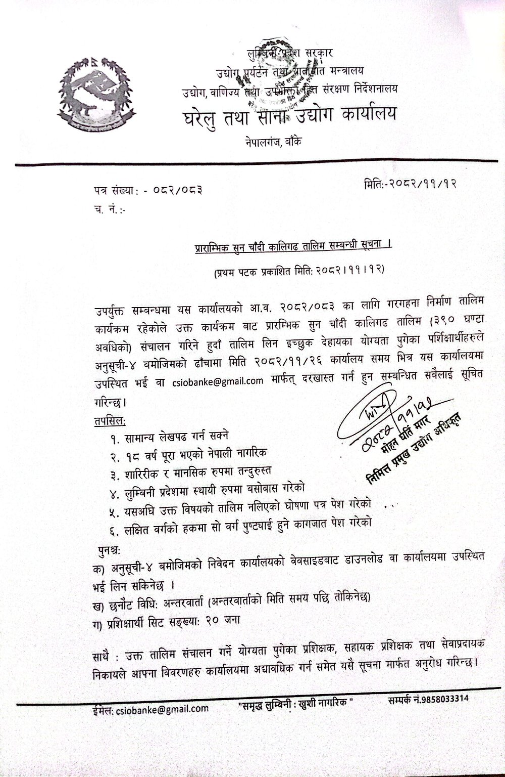 फागुन १२, २०८२ प्रारम्भिक सुन चाँदी कालिगढ तालिम सम्बन्धी सूचना