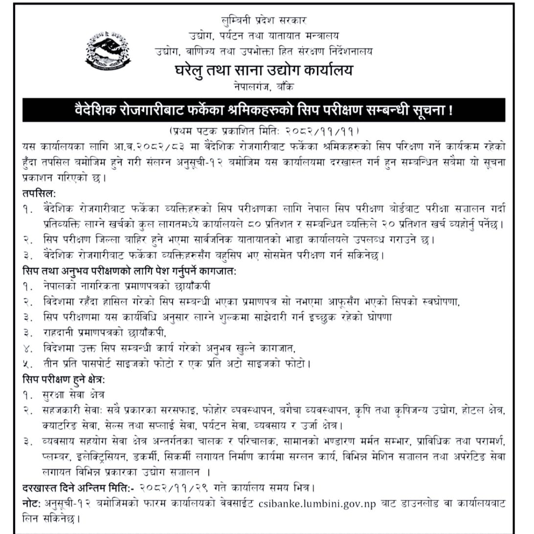 फागुन १२, २०८२ बैदेशिक रोजगारीबाट फर्केका श्रमिकहरुको सिप परीक्षणसम्बन्धी सूचना